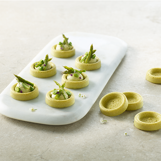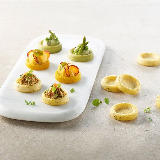 La Minipolenta de Guisantes ofrece una base ideal para elaborar fácilmente piezas de cóctel generosas y gourmet. Su formato de 10 g se convierte en una pieza de dos bocados una vez rellena, ideal para bufés, cócteles o pausas para seminarios.